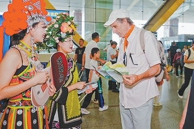 在云南昆明長水國際機場舉行的南華野生菌推介活動上,工作人員向外國友人介紹野生菌產(chǎn)品。南華縣委宣傳部供圖
