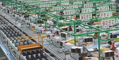 陜西洛川縣一家果業(yè)企業(yè)的蘋果包裝生產(chǎn)線,工作人員正在進行包裝作業(yè)。李 進攝