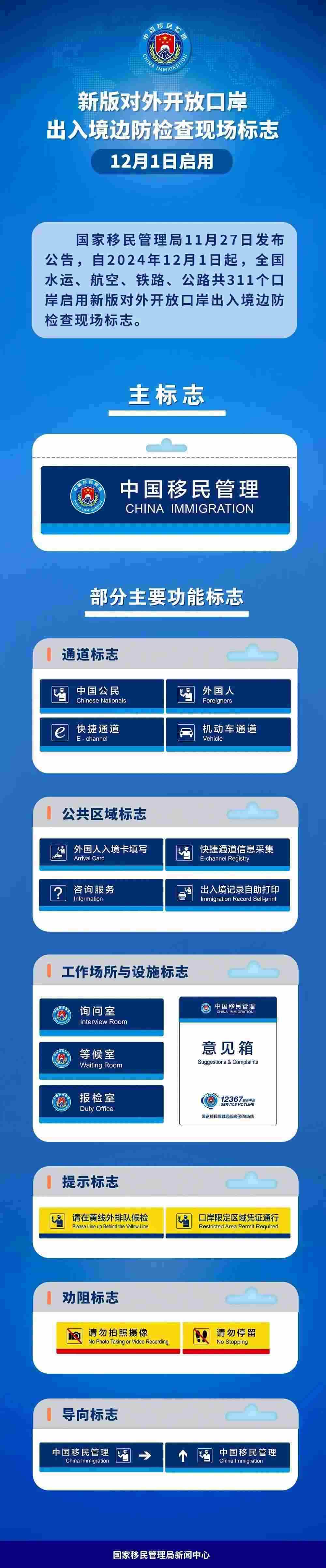 國家移民管理局相關(guān)負(fù)責(zé)人表示,啟用新版對外開放口岸出入境邊防檢查現(xiàn)場標(biāo)志,有利于進(jìn)一步規(guī)范邊檢現(xiàn)場執(zhí)法執(zhí)勤管理,更好展現(xiàn)新時代移民管理機構(gòu)新形象;有利于進(jìn)一步便利中外人員在口岸快速辨識、準(zhǔn)確獲取相關(guān)信息,自覺配合出入境邊防檢查機關(guān)實施邊檢工作,做到有序候檢、順暢通關(guān),增強通關(guān)體驗;有利于進(jìn)一步提高社會各界對移民管理工作的認(rèn)知度,方便廣大出入境人員進(jìn)行監(jiān)督。如遇相關(guān)問題可詢問現(xiàn)場移民管理警察,或撥打12367移民管理服務(wù)熱線咨詢。
