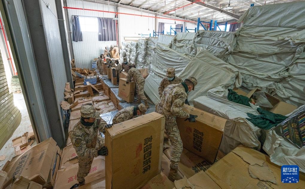1月8日,在日喀則市經(jīng)開區(qū)物資儲備倉庫,武警官兵在搬運抗震救災(zāi)物資。
