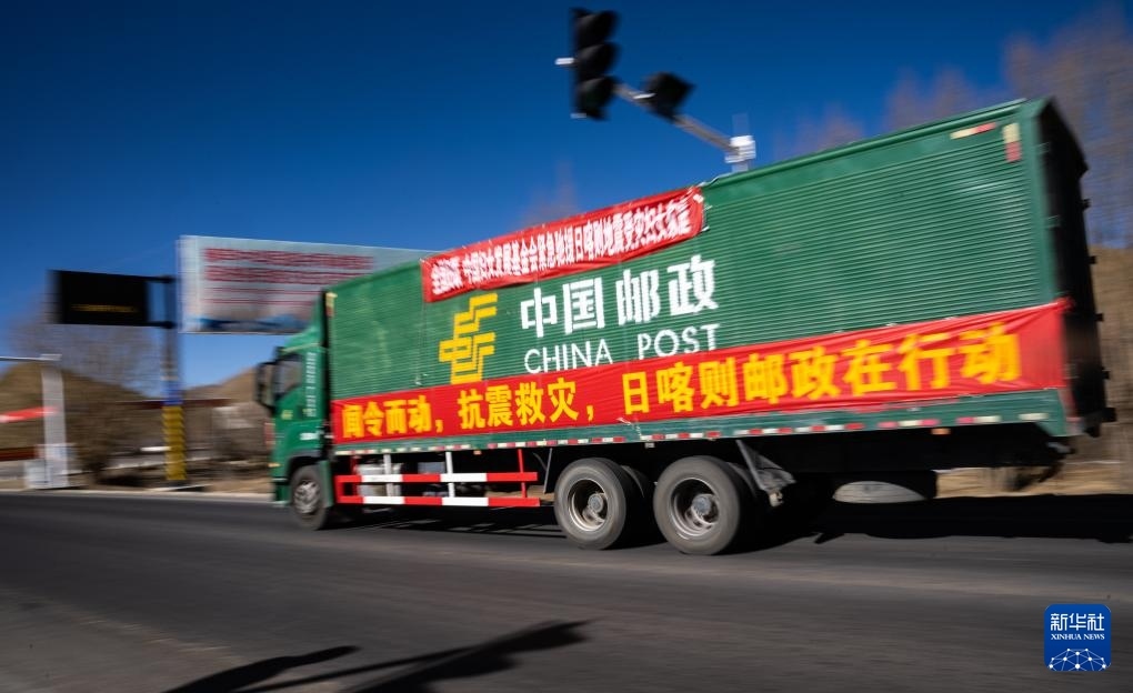1月8日,在日喀則市境內(nèi)的318國道旁,中國郵政的抗震救災(zāi)物資運輸車輛向震中方向駛?cè)ァ?/p>