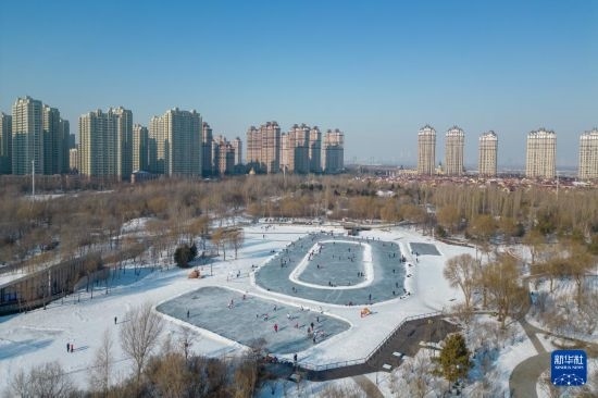 1月18日,人們在哈爾濱市丁香公園內(nèi)體驗(yàn)冰上運(yùn)動(無人機(jī)照片)。