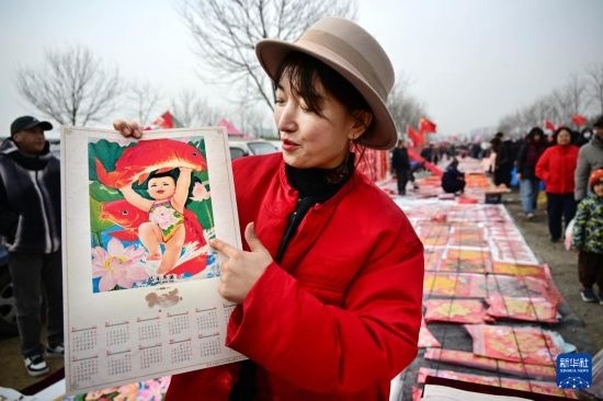 1月18日,一名攤主在泊里大集上推銷傳統(tǒng)年畫。