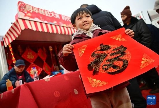 1月18日,一名小男孩在泊里大集非遺互動區(qū)領取福字。