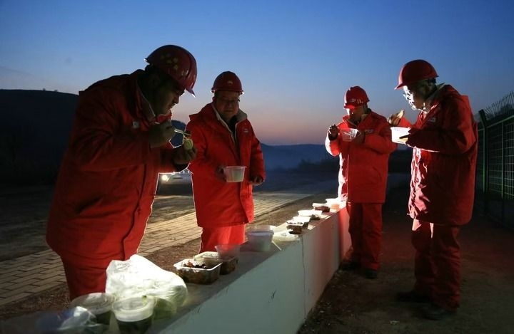 1月28日,長(zhǎng)慶油田第二采油廠搶險(xiǎn)隊(duì)員在井場(chǎng)吃了一頓特殊的“年夜飯”。新華社發(fā)