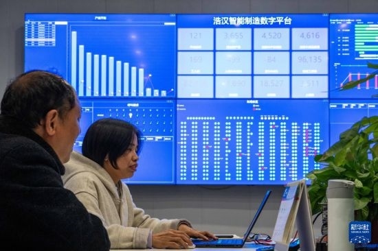 2月24日,在沅江高新區(qū)服裝產(chǎn)業(yè)園一家制衣企業(yè),工作人員通過(guò)智能制造數(shù)字平臺(tái)了解車間生產(chǎn)情況。