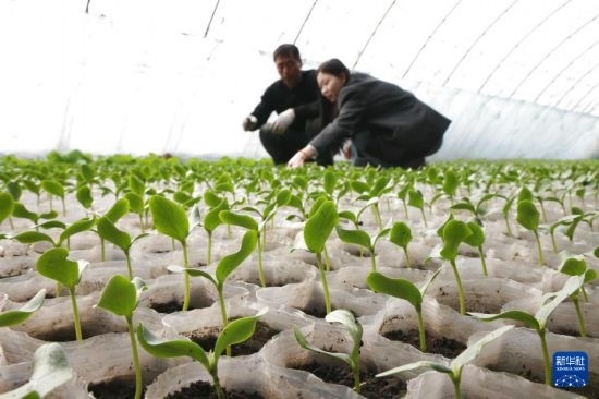 3月20日,在黑龍江省北安市通北鎮(zhèn)東北亞現(xiàn)代蔬菜產(chǎn)業(yè)園溫室大棚內(nèi),技術(shù)人員(右)在指導(dǎo)種植戶(hù)管理黃瓜苗。