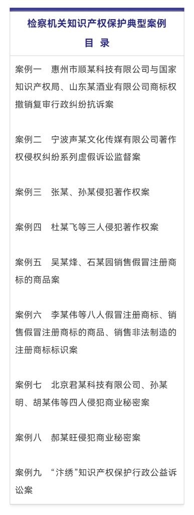 最高人民檢察院日前發(fā)布9件檢察機(jī)關(guān)知識(shí)產(chǎn)權(quán)保護(hù)典型案例,展現(xiàn)知識(shí)產(chǎn)權(quán)檢察綜合履職的工作成效。