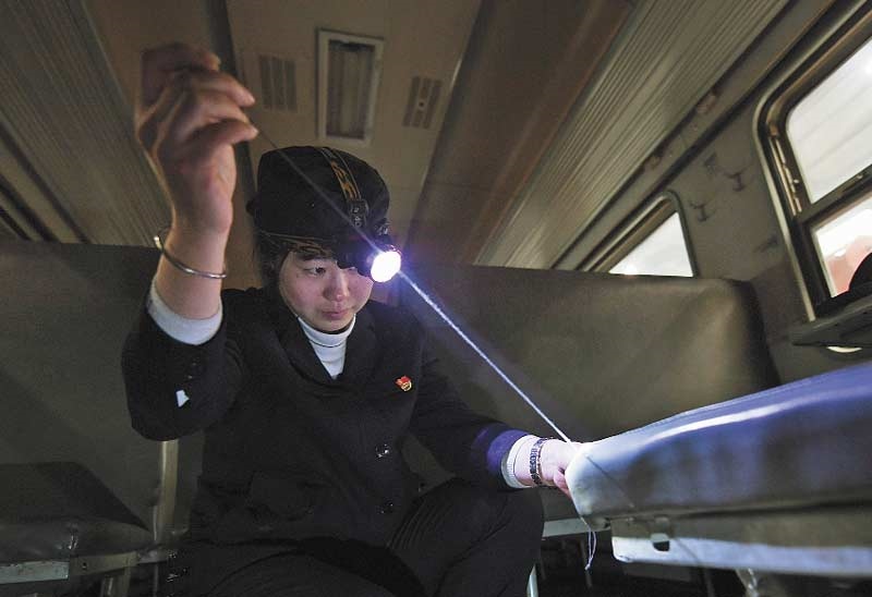 1月14日,在中鐵呼和浩特局包頭車(chē)輛段的維修車(chē)間內(nèi),機(jī)械師們?cè)诟髯詬徫簧厦β抵?。縫紉工劉笑紅正在檢查車(chē)廂內(nèi)的座椅:“看,這些小的破洞就是煙頭燙的,不但難看,乘客長(zhǎng)時(shí)間坐著會(huì)很不舒服?!眲⑿t一邊說(shuō)一邊穿針引線,不一會(huì)兒就將破損的地方縫好了。不仔細(xì)看,竟看不出有破損痕跡。