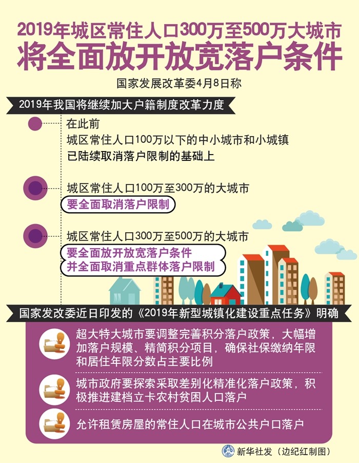 國(guó)家發(fā)展改革委8日稱(chēng),2019年我國(guó)將繼續(xù)加大戶(hù)籍制度改革力度,在此前城區(qū)常住人口100萬(wàn)以下的中小城市和小城鎮(zhèn)已陸續(xù)取消落戶(hù)限制的基礎(chǔ)上,城區(qū)常住人口100萬(wàn)至300萬(wàn)的大城市要全面取消落戶(hù)限制;城區(qū)常住人口300萬(wàn)至500萬(wàn)的大城市要全面放開(kāi)放寬落戶(hù)條件,并全面取消重點(diǎn)群體落戶(hù)限制。