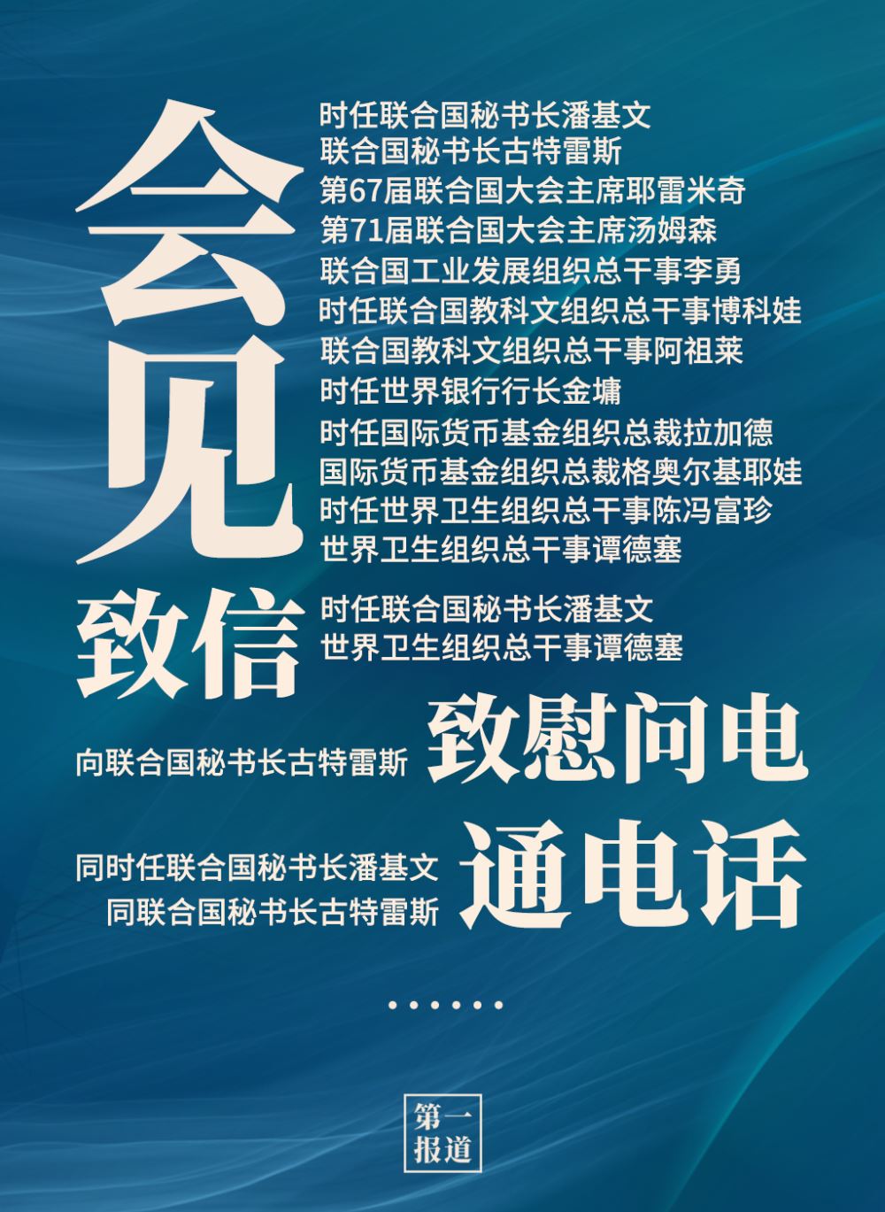 2013年以來,習(xí)主席通過會(huì)見、通話、致信函等多種方式同聯(lián)合國主要官員保持密切溝通?;?dòng)對象包括聯(lián)合國秘書長、聯(lián)合國大會(huì)主席,還有聯(lián)合國工業(yè)發(fā)展組織、聯(lián)合國教科文組織、世界銀行、國際貨幣基金組織、世界衛(wèi)生組織等聯(lián)合國專門機(jī)構(gòu)主要負(fù)責(zé)人。
