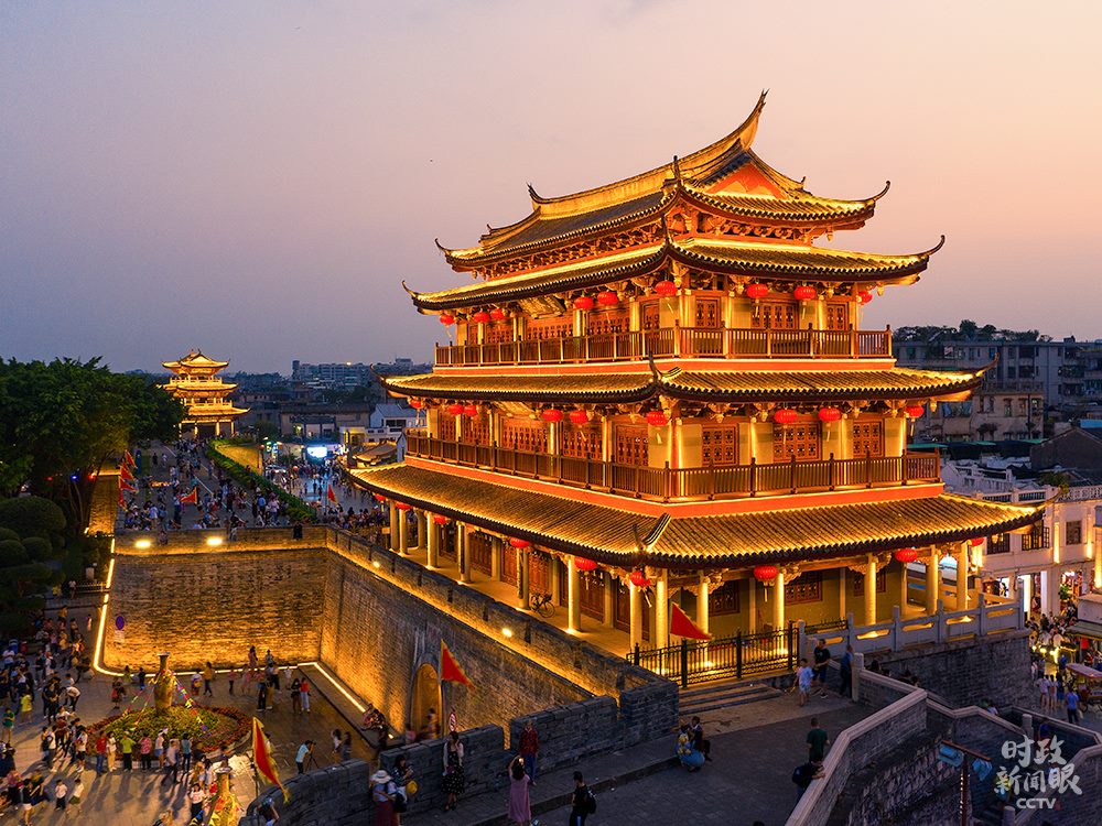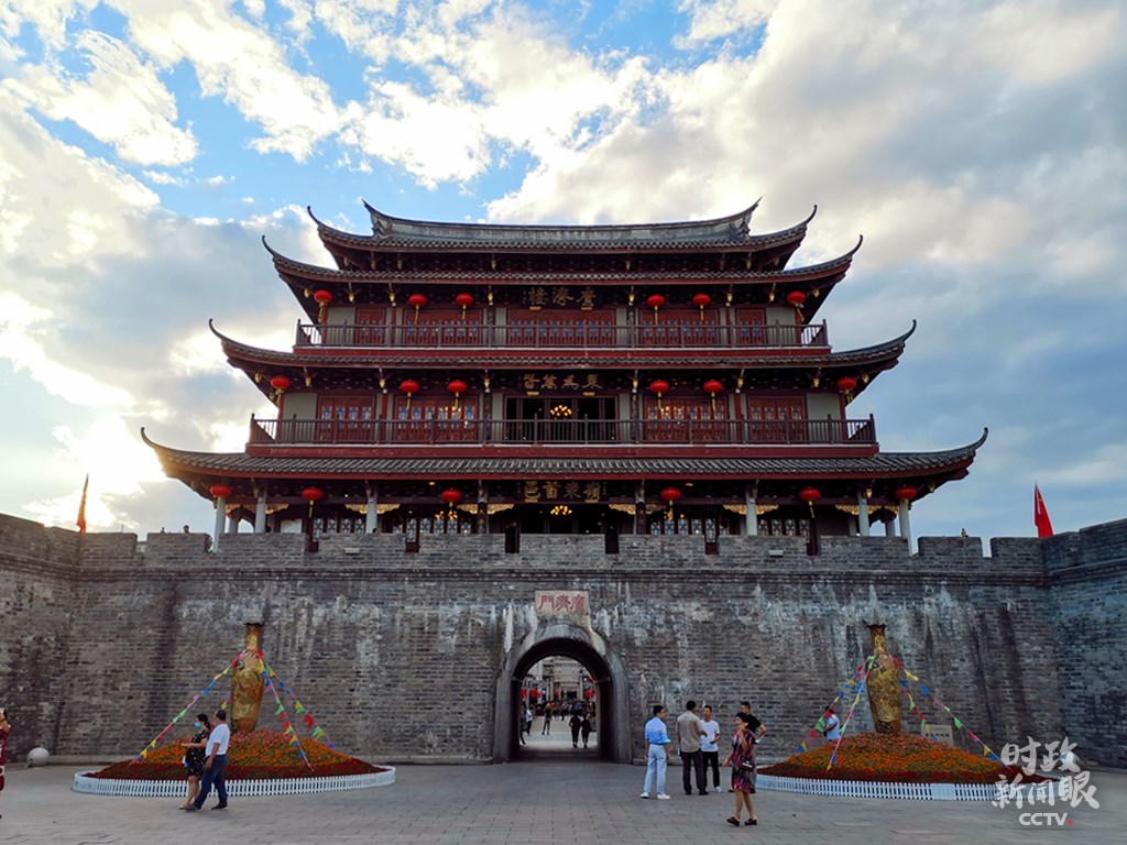 △修復(fù)后的廣濟門城樓高24.5米,城樓上的“東為萬春”和“嶺東首邑”分別由國際漢學(xué)大師饒宗頤、書法家劉炳森題寫。(總臺央視記者楊立峰拍攝)