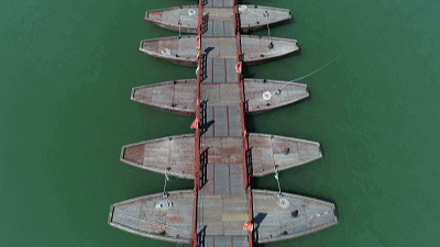 廣濟橋東西兩邊分別有12個和8個橋墩,中間是18艘木船連成浮橋。正常通航時,木船閉合,行人從橋上經(jīng)過,過往船只從兩邊的橋墩間穿行。汛期洪水泛濫時,則將木船解開,既方便船只通過,也方便排水入海,這就是啟閉式的作用。
