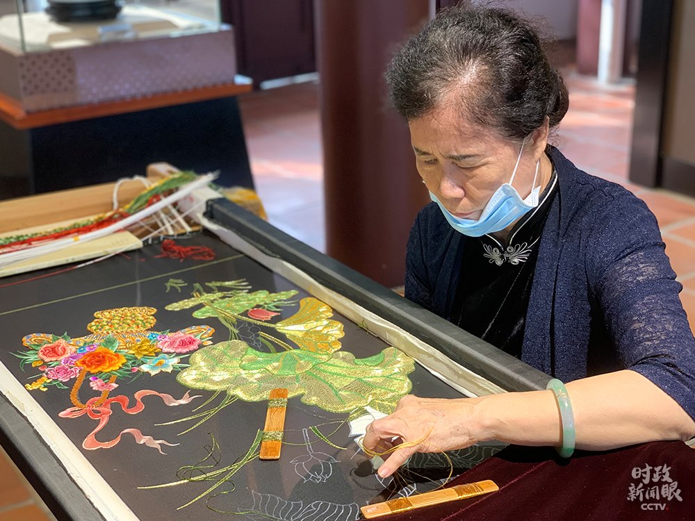 △目前廣濟樓樓內(nèi)一、二樓分別辟為“潮州通史展”和“潮州非物質(zhì)文化遺產(chǎn)陳列展”展廳。這是潮州刺繡。(總臺央視記者郭晗光拍攝)