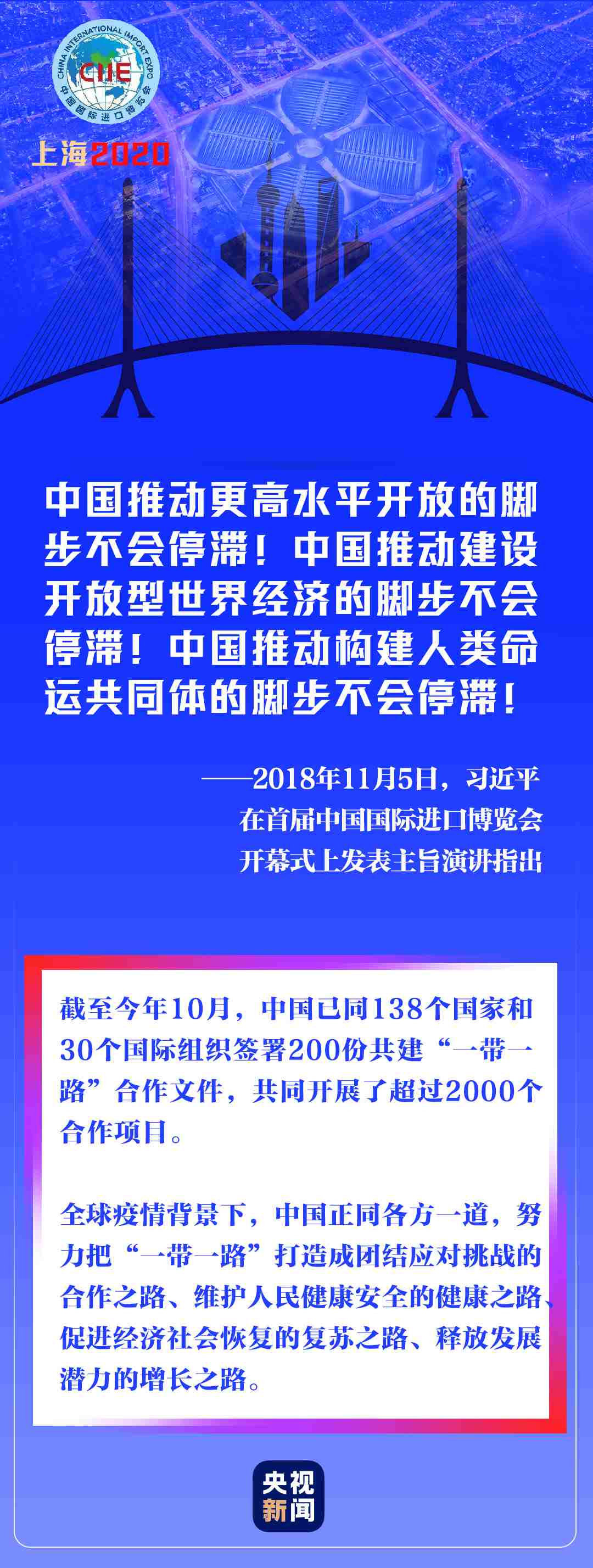 在新冠肺炎疫情全球蔓延、世界經(jīng)濟(jì)持續(xù)低迷的非常時期,進(jìn)博會如期而至,為世界各國各地區(qū)搭建通往更多市場機(jī)遇、投資機(jī)遇、增長機(jī)遇的橋梁。