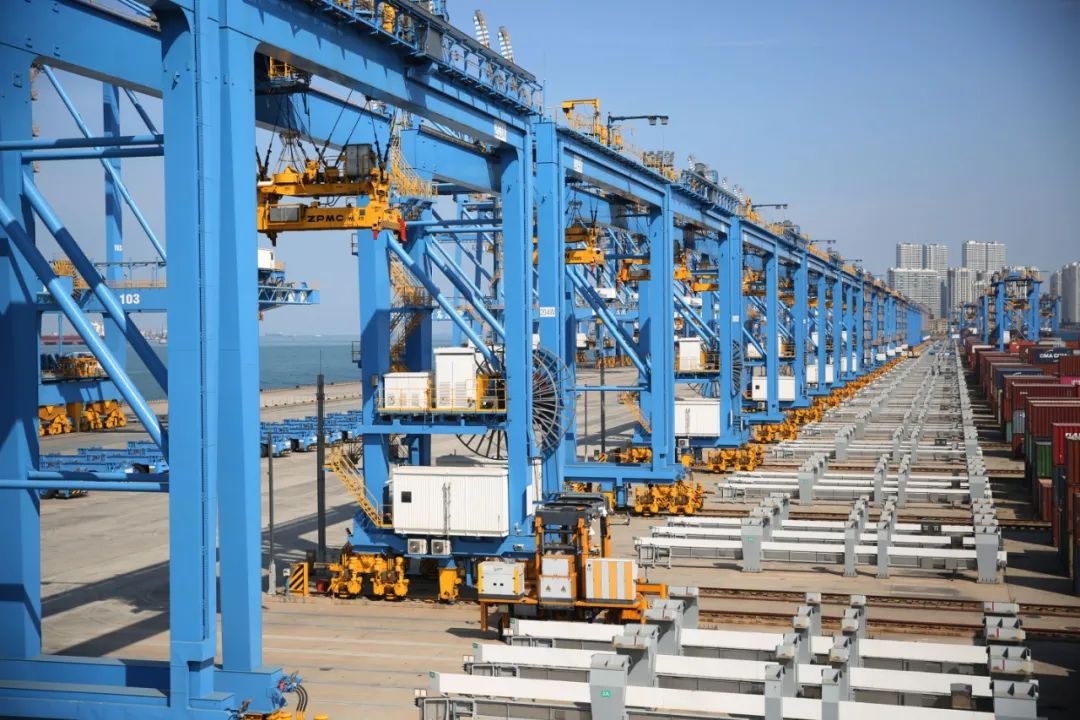 △10月8日,位于山東自貿(mào)區(qū)青島片區(qū)的山東港口青島港全自動(dòng)化碼頭集裝箱堆場一派繁忙景象。