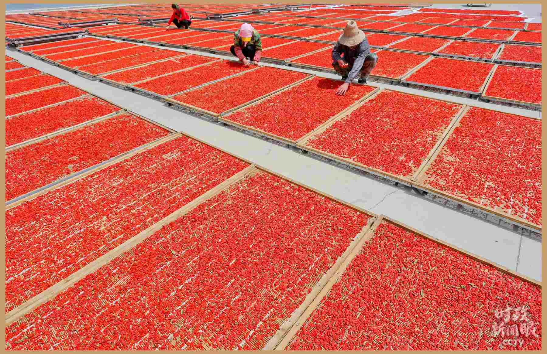△甘肅張掖苗家堡村“扶貧車間”里,農戶在晾曬枸杞。