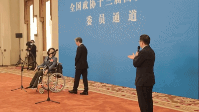 △首場(chǎng)“委員通道”活動(dòng)上,中國(guó)美協(xié)主席范迪安推著中國(guó)殘聯(lián)主席張海迪退場(chǎng)。(總臺(tái)央視記者魏毅拍攝)
