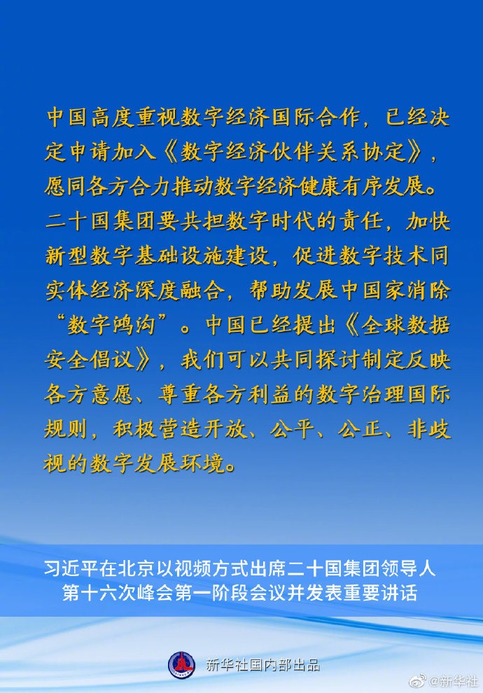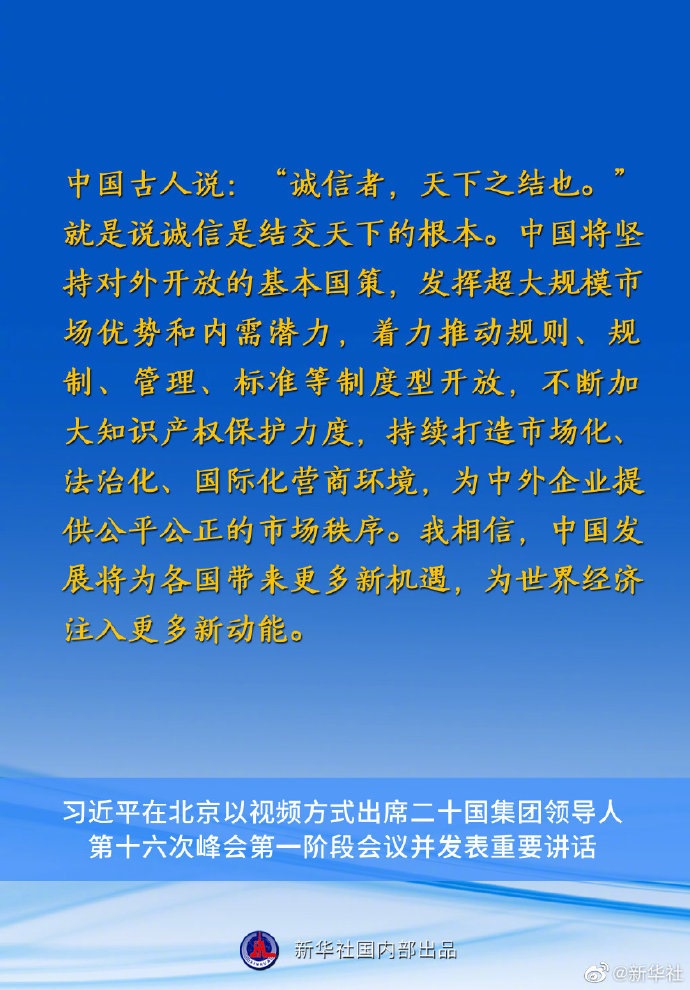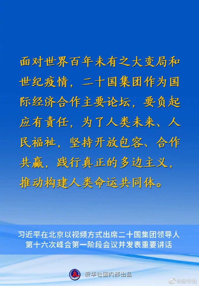 國(guó)家主席習(xí)近平10月30日在北京以視頻方式出席二十國(guó)集團(tuán)領(lǐng)導(dǎo)人第十六次峰會(huì)第一階段會(huì)議并發(fā)表重要講話。講話有哪些要點(diǎn),一起來看↓