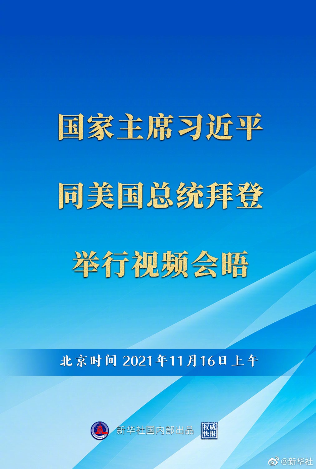 經(jīng)中美雙方商定,國(guó)家主席習(xí)近平于北京時(shí)間11月16日上午同美國(guó)總統(tǒng)拜登舉行視頻會(huì)晤,就中美關(guān)系和雙方共同關(guān)心的問題交換意見?,F(xiàn)在會(huì)晤已開始舉行。