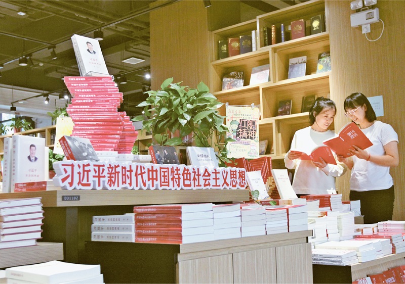 黨確立習(xí)近平同志黨中央的核心、全黨的核心地位,確立習(xí)近平新時(shí)代中國特色社會(huì)主義思想的指導(dǎo)地位,反映了全黨全軍全國各族人民共同心愿,對(duì)新時(shí)代黨和國家事業(yè)發(fā)展、對(duì)推進(jìn)中華民族偉大復(fù)興歷史進(jìn)程具有決定性意義。圖為2021年10月4日,河南省焦作市博愛縣新華書店里,讀者在閱讀習(xí)近平新時(shí)代中國特色社會(huì)主義思想相關(guān)書籍?!≈行律绨l(fā) 程全/攝