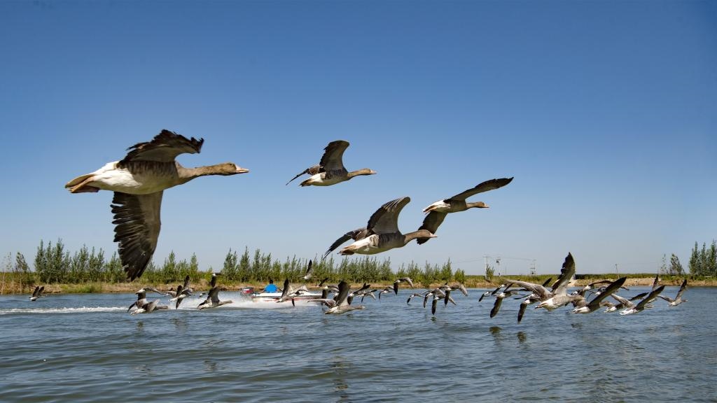 一群灰雁在衡水湖國家濕地公園水面上嬉戲飛翔(2018年9月28日攝)。新華社記者朱旭東攝