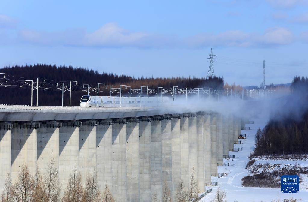 試運行期間,高鐵列車行駛在沈佳高鐵白敦段上(2021年12月3日攝,無人機照片)。2021年12月24日,沈陽至佳木斯高鐵長白山至敦化段正式開通運營,長白山風景區(qū)接入全國高鐵網,長春至長白山最快2小時18分可達。沈佳高鐵白敦段位于吉林省延邊朝鮮族自治州境內,設計時速250公里,由于其穿越原始森林,被譽為“森林高鐵”。新華社發(fā)(劉慎庫 攝)
