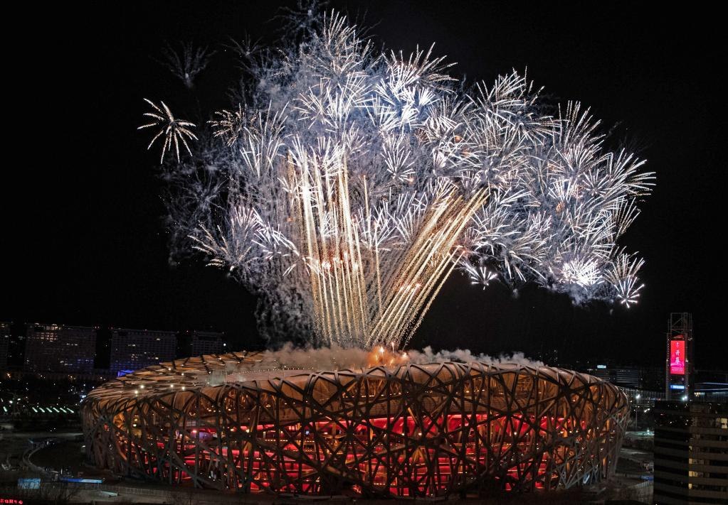 2月4日晚,第二十四屆冬季奧林匹克運(yùn)動(dòng)會開幕式在北京國家體育場舉行。圖為焰火表演。新華社記者鄔惠我攝