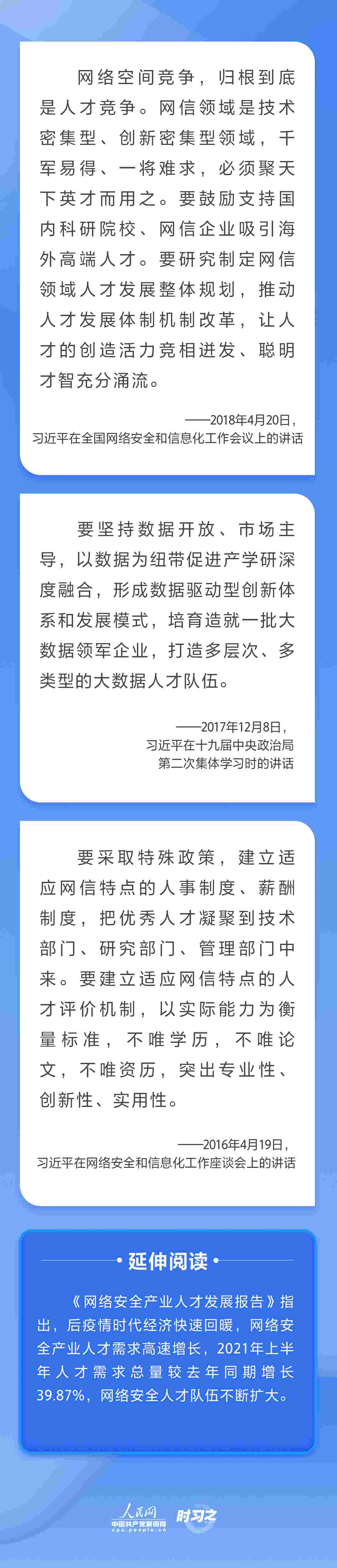 “網(wǎng)信領(lǐng)域是技術(shù)密集型、創(chuàng)新密集型領(lǐng)域,千軍易得、一將難求,必須聚天下英才而用之?!秉h的十八大以來,習(xí)近平總書記多次就網(wǎng)信事業(yè)發(fā)展作出重要論述,并將抓好人才工作擺在治國理政的重要位置,為新時代網(wǎng)信人才工作和網(wǎng)信人才事業(yè)發(fā)展指明了前進方向。