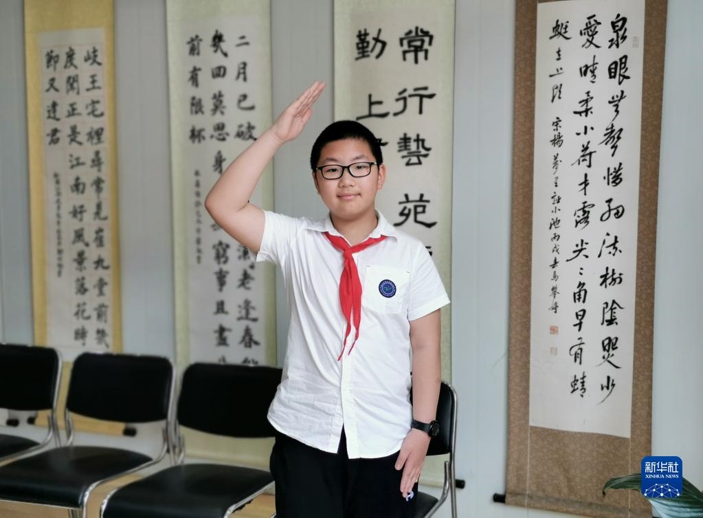 大陳島老墾荒隊(duì)員后代、浙江省臺州市椒江區(qū)實(shí)驗(yàn)二小學(xué)生李杭駿行隊(duì)禮(2019年5月27日攝)。新華社發(fā)(王衛(wèi)君 攝)