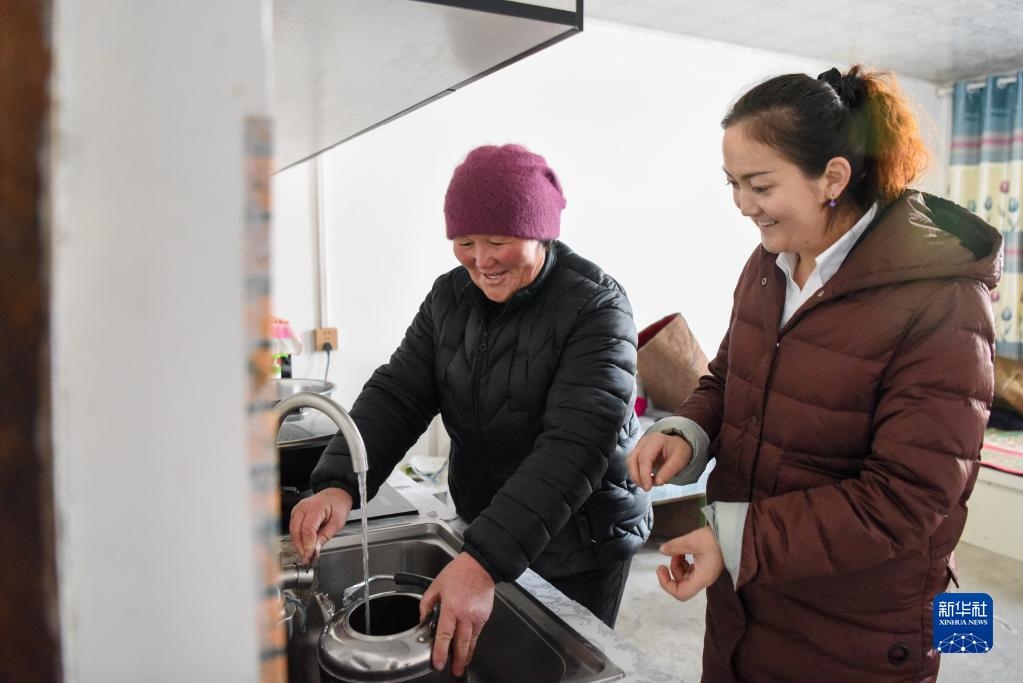 在新疆福??h解特阿熱勒鎮(zhèn)京什開薩爾村,村干部(右)來到前不久剛接通自來水的村民家中了解水質(zhì)情況(2021年11月25日攝)。新華社記者 丁磊