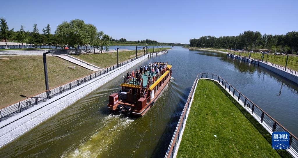 2022年6月24日,京杭大運(yùn)河京冀段全線62公里實現(xiàn)游船通航。這是載著北京游客和建設(shè)者代表的游船通過船閘進(jìn)入京杭大運(yùn)河河北段。新華社記者 李欣 攝