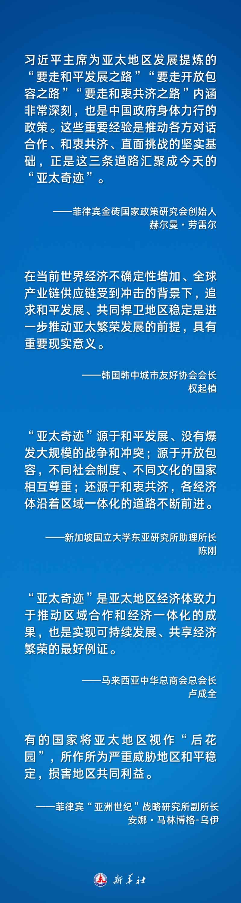 習近平主席的系列重要講話在國際社會引發(fā)熱烈反響。多國人士認為,習近平主席全面總結了“亞太奇跡”的經驗與啟示,就攜手構建亞太命運共同體提出重要主張,深刻闡釋了中國式現代化的機遇與貢獻,為再創(chuàng)亞太合作新輝煌注入強勁動力。
