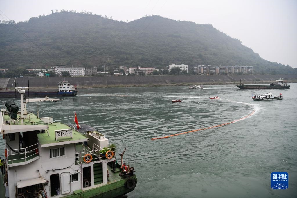 11月9日,在四川省宜賓市敘州區(qū)的長江流域突發(fā)生態(tài)環(huán)境事件應(yīng)急綜合演練現(xiàn)場(chǎng),多方部門協(xié)作在金沙江面布設(shè)圍油欄。新華社記者 王曦 攝