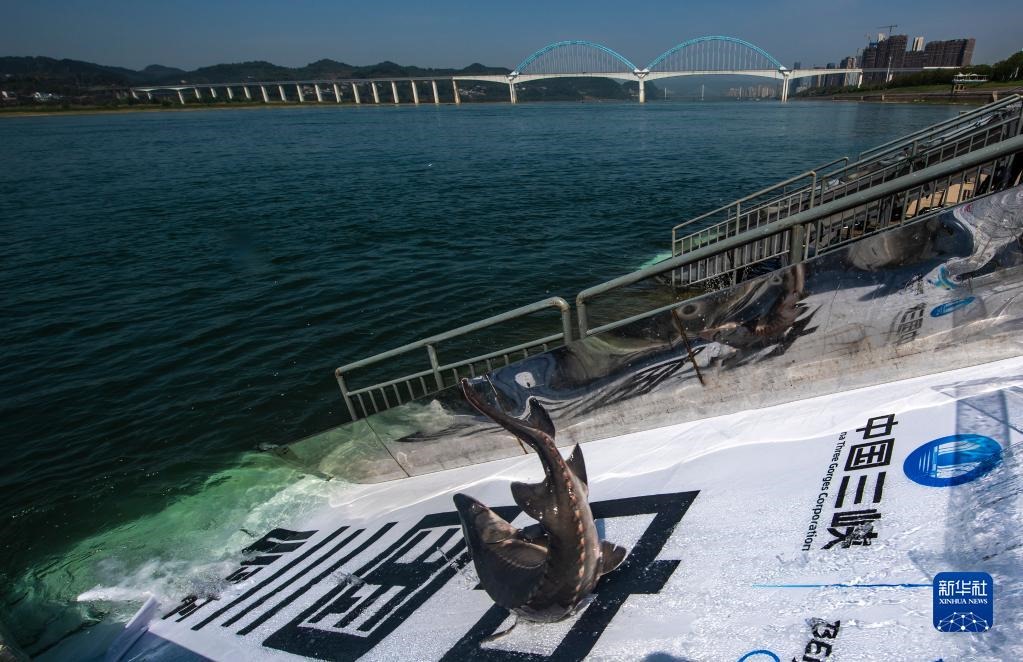 在湖北省宜昌市舉行的“2022年長江三峽中華鱘放流活動(dòng)”現(xiàn)場(chǎng),中華鱘從放流通道滑入長江(4月9日攝)。新華社發(fā)(鄭家裕 攝)