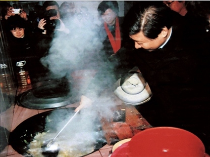 2007年1月,時(shí)任浙江省委書(shū)記習(xí)近平(右一)在浙江省慶元縣屏都鎮(zhèn)敬老院為老人們炒菜。新華社發(fā)