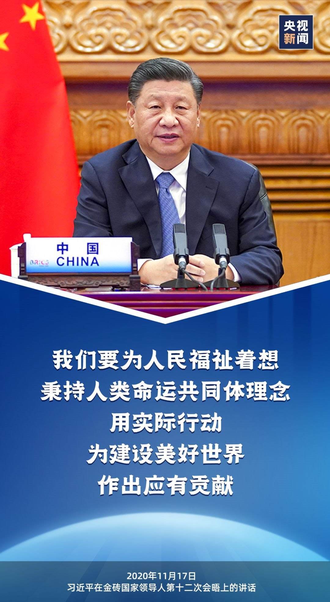 2020年11月17日,國家主席習近平出席金磚國家領(lǐng)導人第十二次會晤并發(fā)表重要講話時指出,“我們要為人民福祉著想,秉持人類命運共同體理念,用實際行動為建設(shè)美好世界作出應(yīng)有貢獻?!?/p>