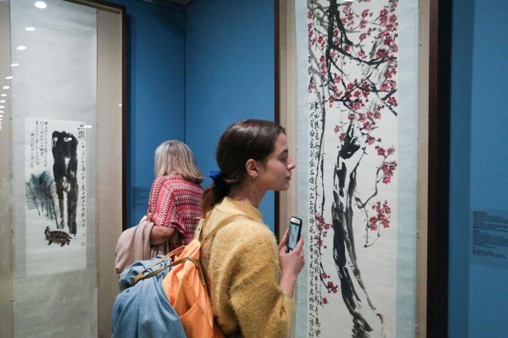 △觀眾在希臘雅典塞奧哈拉基斯藝術基金會美術館觀看中國的藝術展。