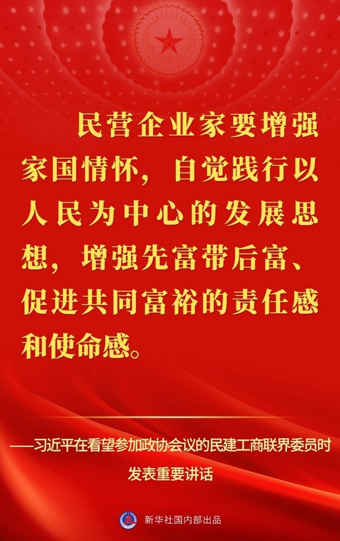 “黨中央始終堅持‘兩個毫不動搖’、‘三個沒有變’,始終把民營企業(yè)和民營企業(yè)家當(dāng)作自己人?!?月6日,習(xí)近平總書記在看望參加全國政協(xié)十四屆一次會議的民建、工商聯(lián)界委員并參加聯(lián)組會時發(fā)表重要講話,強(qiáng)調(diào)要引導(dǎo)民營企業(yè)和民營企業(yè)家正確理解黨中央方針政策,增強(qiáng)信心、輕裝上陣、大膽發(fā)展。