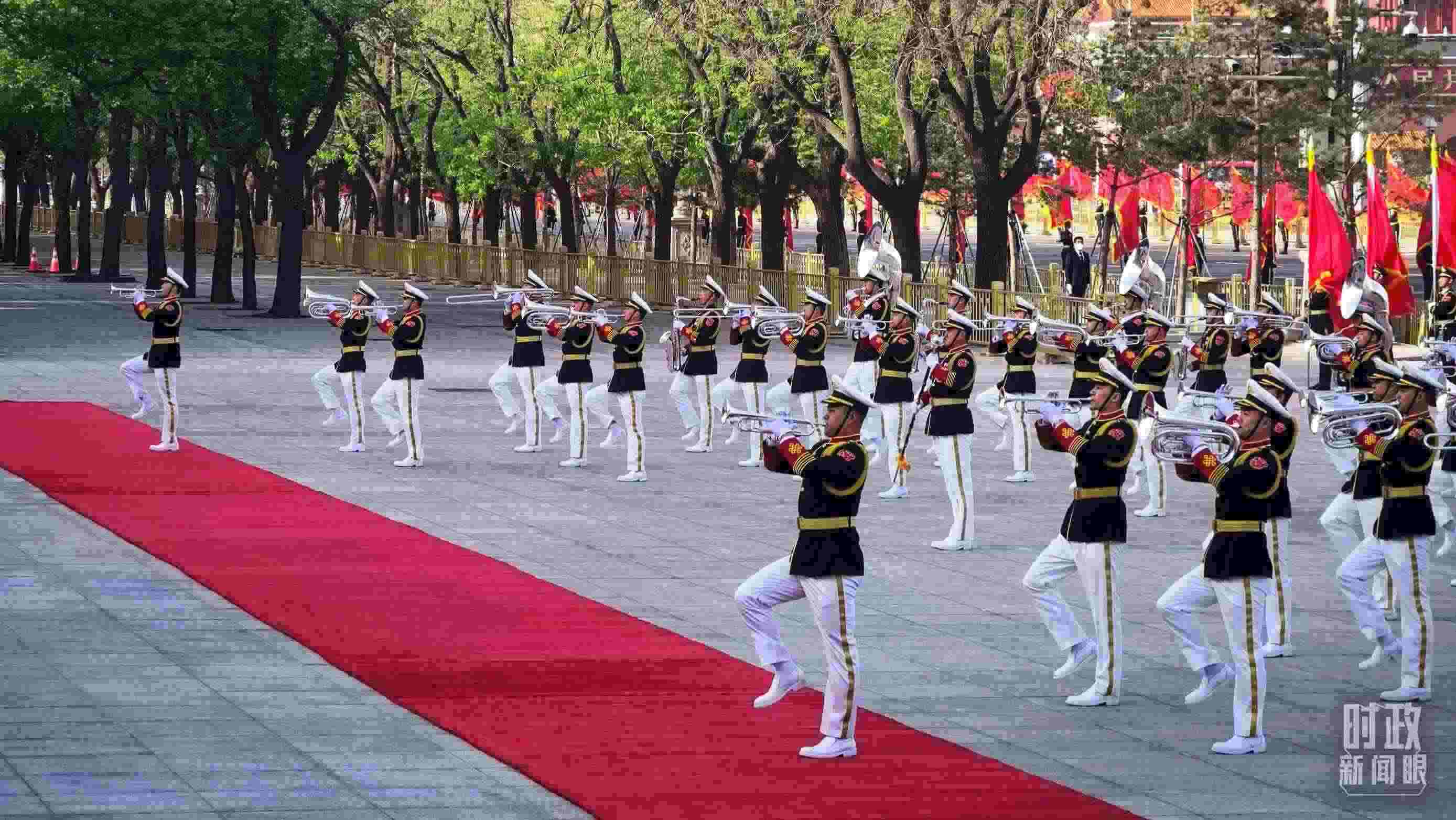 △歡迎儀式現(xiàn)場的軍樂團正在進行行進吹奏表演。(總臺央廣記者潘毅拍攝)