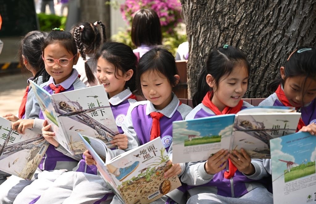 圖為清華附小校園里孩子們在樹下讀書。采訪對象供圖