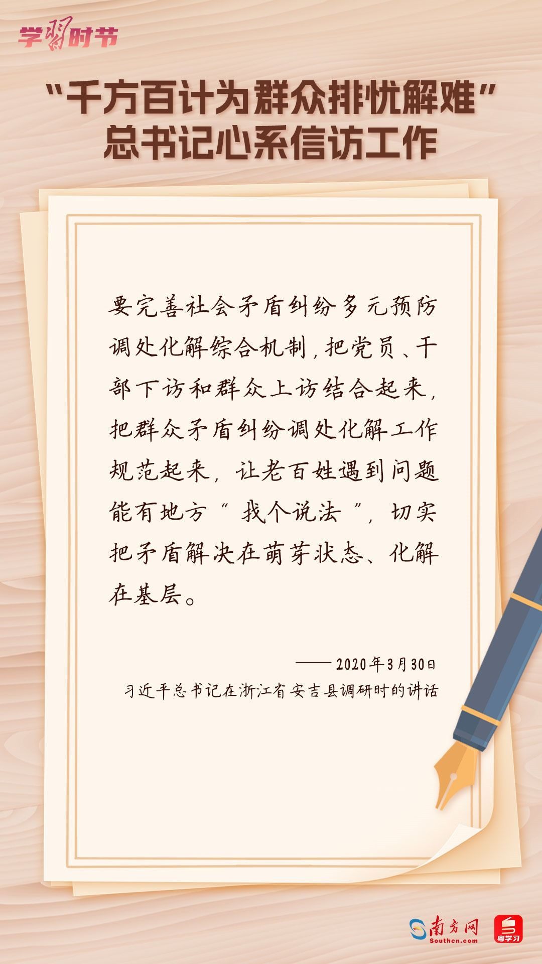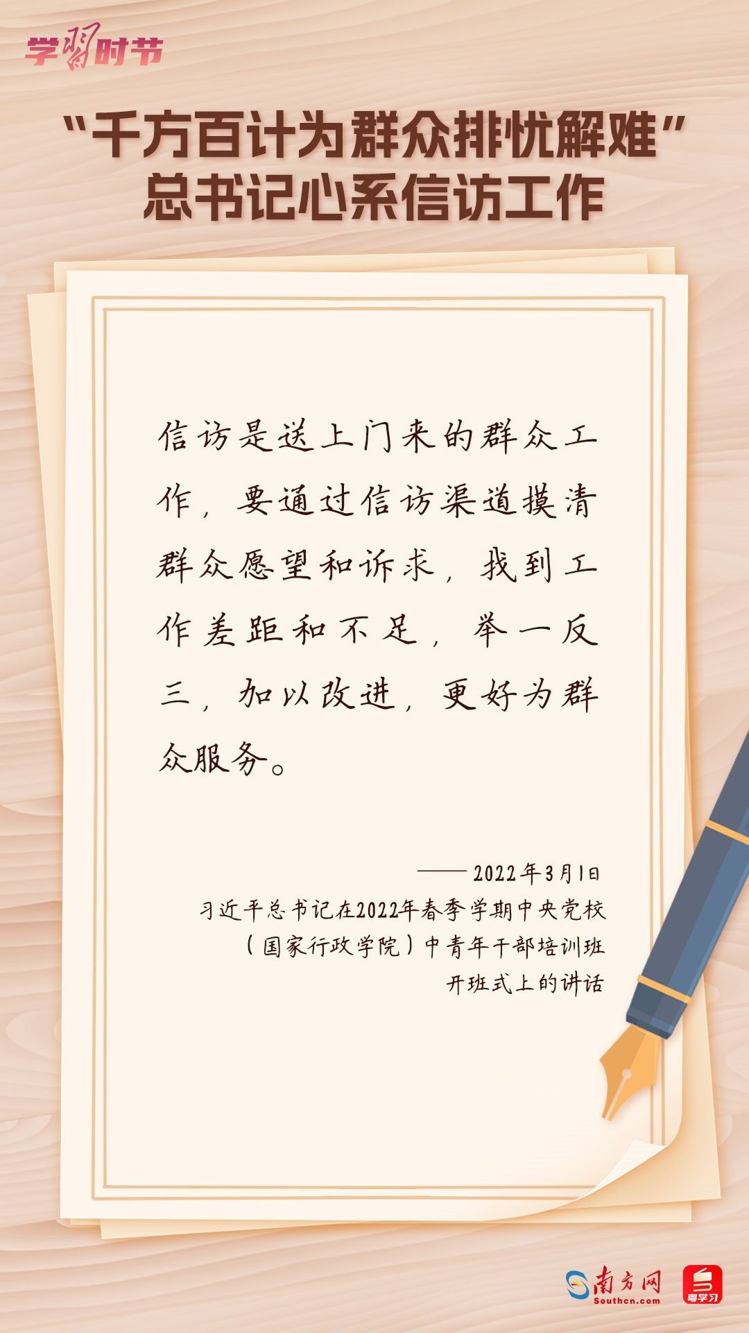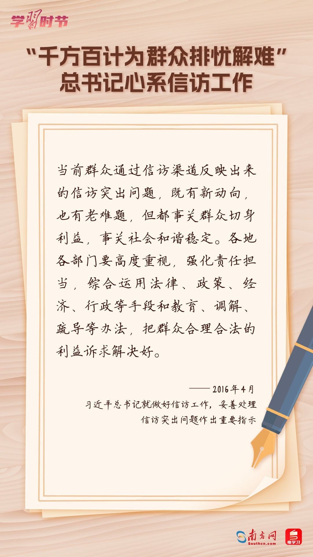 2022年5月1日,中共中央、國務(wù)院印發(fā)的《信訪工作條例》正式實(shí)施?!缎旁L工作條例》以習(xí)近平新時(shí)代中國特色社會主義思想為指導(dǎo),深入貫徹習(xí)近平總書記關(guān)于加強(qiáng)和改進(jìn)人民信訪工作的重要思想,總結(jié)黨長期以來領(lǐng)導(dǎo)和開展信訪工作經(jīng)驗(yàn)特別是黨的十八大以來信訪工作制度改革成果,堅(jiān)持和加強(qiáng)黨對信訪工作的全面領(lǐng)導(dǎo),理順信訪工作體制機(jī)制,是新時(shí)代信訪工作的基本遵循。今年5月1日是《信訪工作條例》實(shí)施一周年,“學(xué)習(xí)時(shí)節(jié)”整理摘錄習(xí)近平總書記關(guān)于信訪工作的重要講話和重要指示批示,與您一同學(xué)習(xí)。