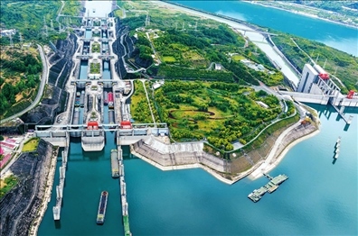 船舶有序通過三峽雙線五級(jí)船閘(2023年4月24日攝) 鄭家裕攝/本刊
