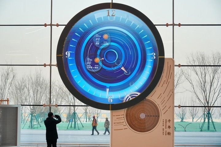 雄安站候車廳,一座“千年輪”吸引著往來旅客的目光。它的起始日期被設(shè)定為2017年4月1日——“雄安”第一次被公眾知曉的日子?!扒贻啞钡牡鬃希澘讨?個金色大字——“千年之計 始于當(dāng)下”。齒輪不停地轉(zhuǎn)動,記錄下歷史前進(jìn)的軌跡。