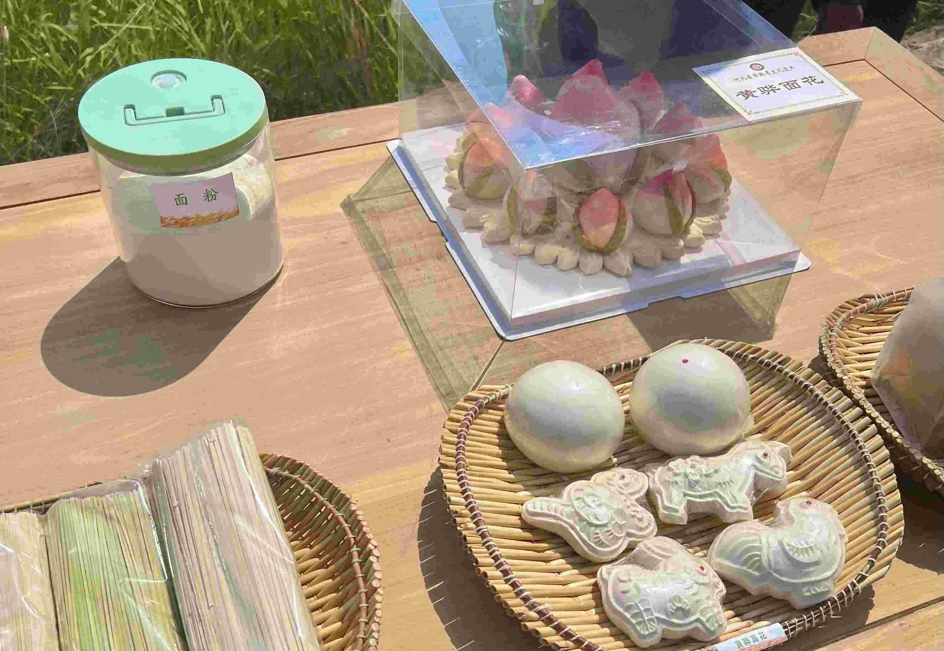 在楊東進(jìn)家麥田的路邊,擺放著一張長方形的木桌。桌上擺放著用于展示的旱堿麥的植株和麥粒樣本,以及由旱堿麥制成的面粉、掛面、饅頭和黃驊面花等產(chǎn)品,總書記在這里駐足觀看。印刻著寓意吉祥圖案的黃驊面花,被列為省級非物質(zhì)文化遺產(chǎn)。