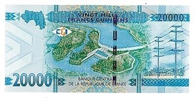 △在幾內(nèi)亞央行發(fā)行的該國(guó)最大面值兩萬幾郎紙幣上,印著中國(guó)長(zhǎng)江三峽集團(tuán)有限公司總承建的凱樂塔水電站。