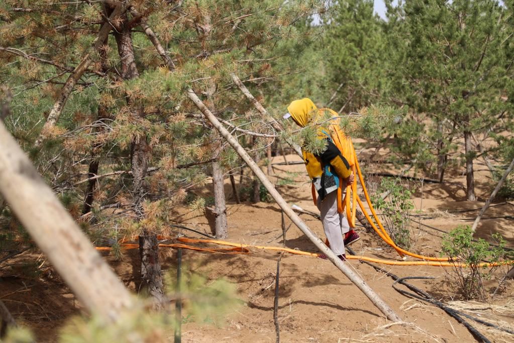 這是2023年5月31日,治沙工人在庫布其沙漠億利生態(tài)治理區(qū)內(nèi)搬運水管,準(zhǔn)備為樹木澆水。新華社記者 王楷焱 攝