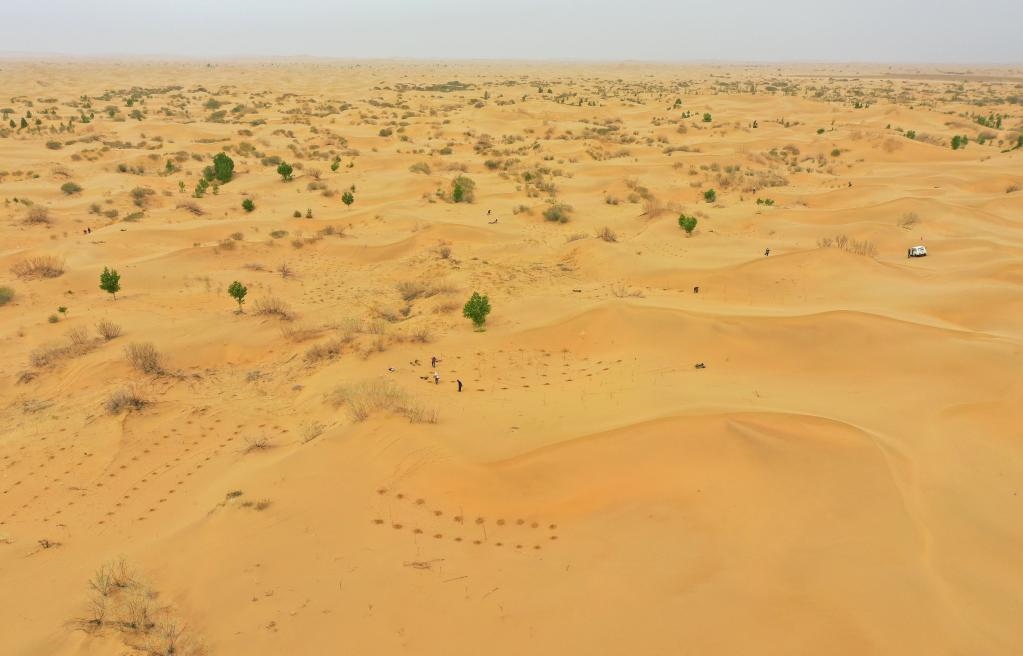 治沙客在內(nèi)蒙古庫布其沙漠億利生態(tài)治理區(qū)種植苗木(2023年4月27日攝,無人機照片)。新華社記者 劉磊 攝