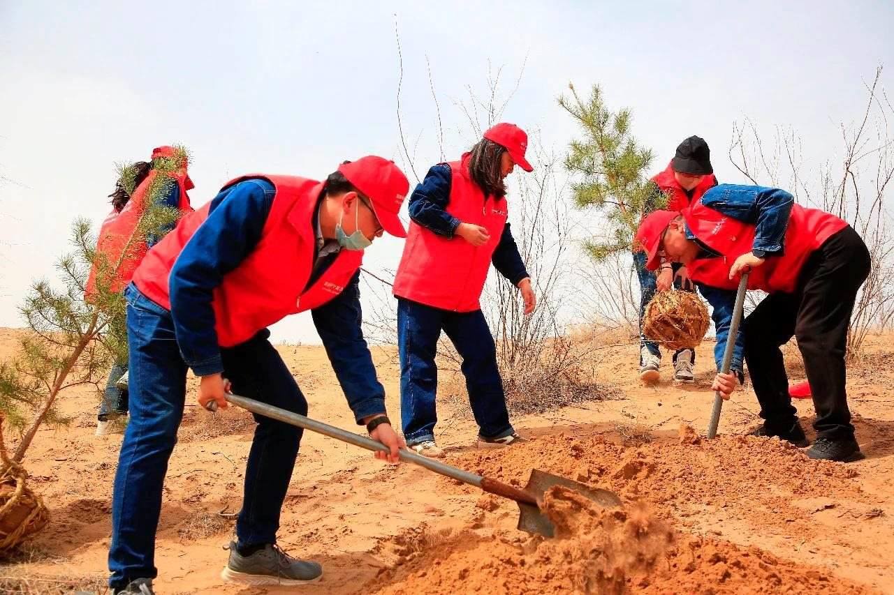 △2023年4月12日,志愿者在寧夏靈武白芨灘國家級自然保護(hù)區(qū)開展義務(wù)植樹、扎草方格。