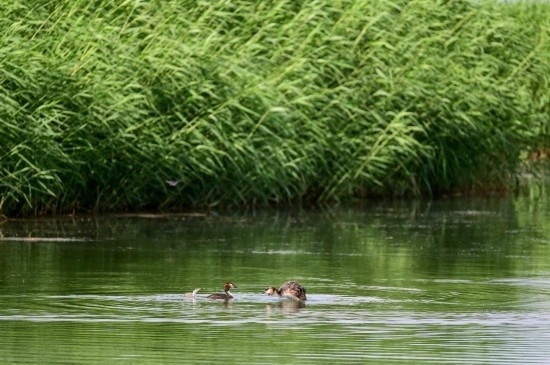 6月5日,水鳥在烏梁素海水面上嬉戲。新華社記者 連振 攝